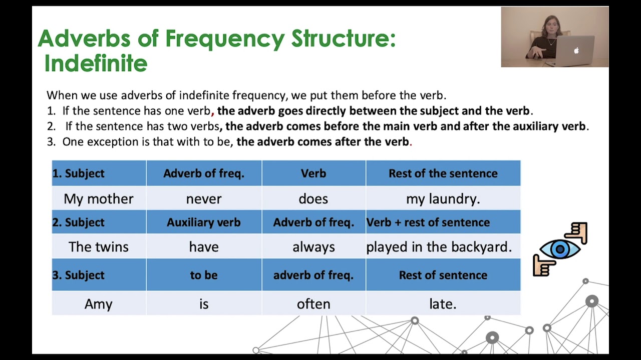 An adverb describing indefinite frequency doesn't specify an exact time frame; The adverb gives more information about the action. Jenna always talks too loud. Adverbs of indefinite frequency occur in the middle of the sentence. The grammar gameshow episode 2.